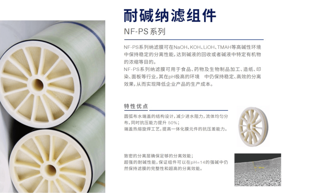 NF-PS系列奈米濾膜可在NaOH、KOH、LiOH、TMAH等高鹼性環境中保持穩定的分離性能,達到鹼液的回收或鹼液中特定有機物的濃縮等目的。